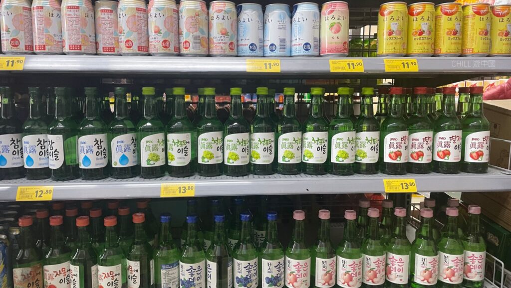 其中最受歡迎的韓國超市裡,貨架上滿是來自韓國的零食與食材:海苔、泡菜、年糕、餅乾、拉麵、飲料一應俱全。也能買到瑪格麗米酒與各式水果燒酒,價格實惠、選擇多樣,是旅人帶伴手禮或體驗韓式生活的好去處。